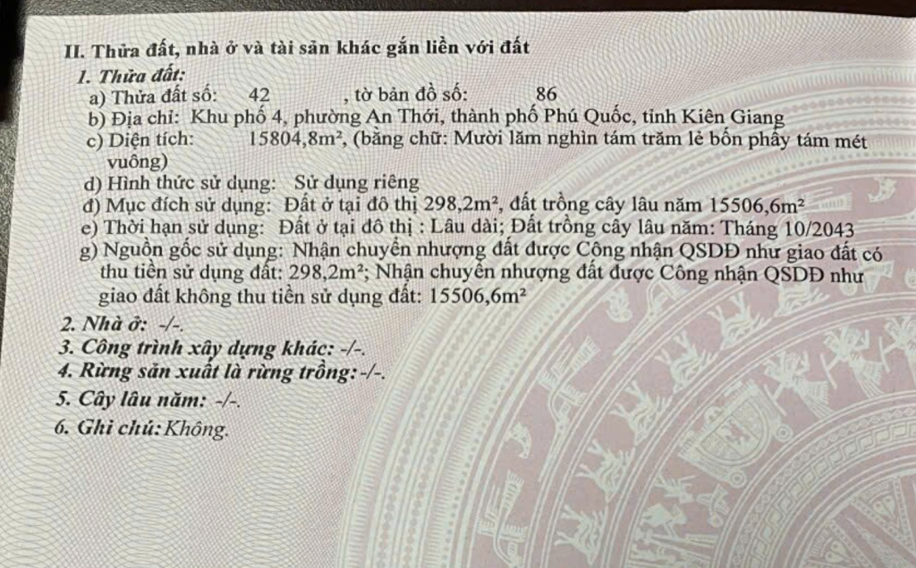 Chủ gửi bán 15 công đất tại khu phố 4, phường An Thới, TP. Phú Quốc. Tổng diện tích hơn 15.800m², trong đó có khoảng 300m² đất thổ cư, thuận tiện xây dựng nhà ở hoặc công trình khai thác.